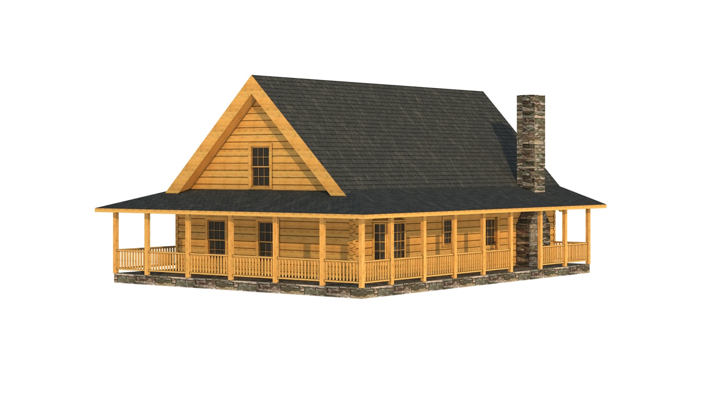 The Albermarle log home is a straight forward design with two main segments of the log cabin. Upon entering, the log home floor plans is the expanse and beauty of the great room. Immediately to the left is a stairway leading to the open balconies loft overlooking the main floor. To the right is a fireplace that serves to light and warm the log cabin.