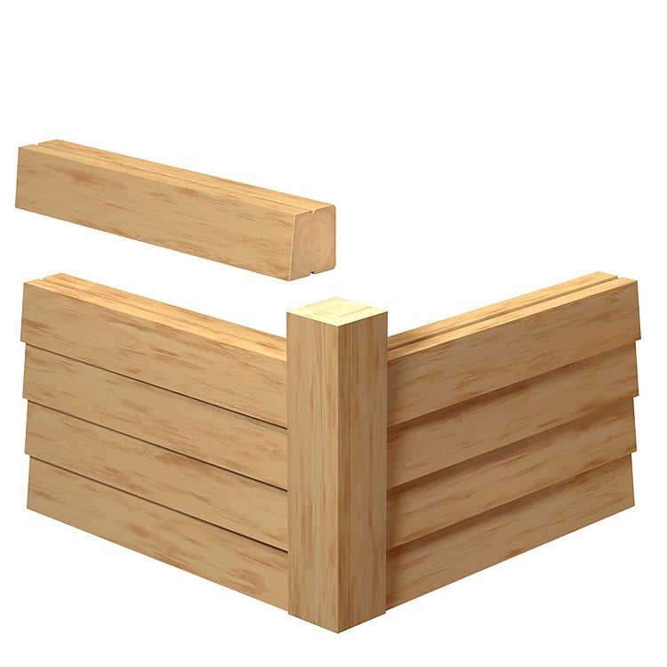 Logs are flat on the exterior and interior. Corners are custom crafted interlocking notches and double tongue and groove joinery for exceptional strength and beauty. A narrow V-groove on the exterior, interior, or both gives a more contemporary appearance. The exterior surface is a rough sawn finish.